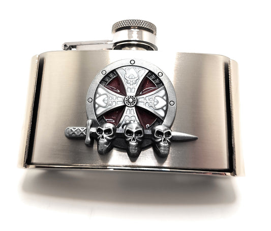 Gothic Skull Flask Belt Buckle – Triple Skulls & Sword | Biker, Rock, Festival Statement Buckle