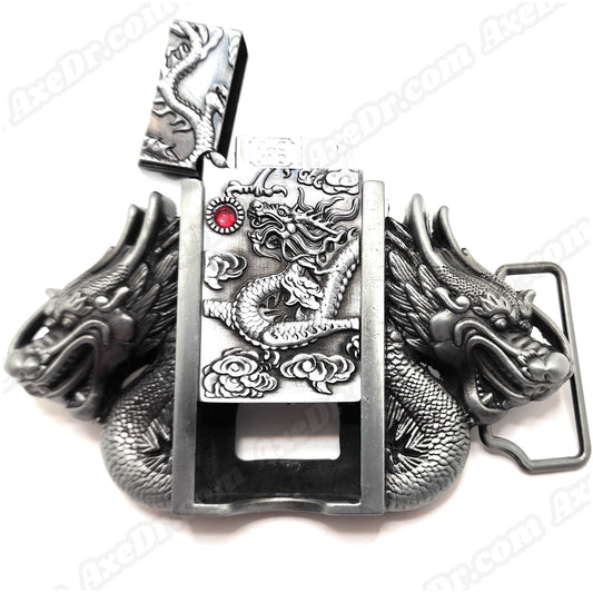 Dual Dragons Silver Lighter Belt Buckle / Push Button Lighter Holder Buckle