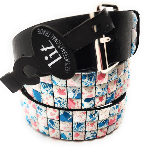 White Pink Blue Paint Spatter Pyramid Studded Leather Belt Punk