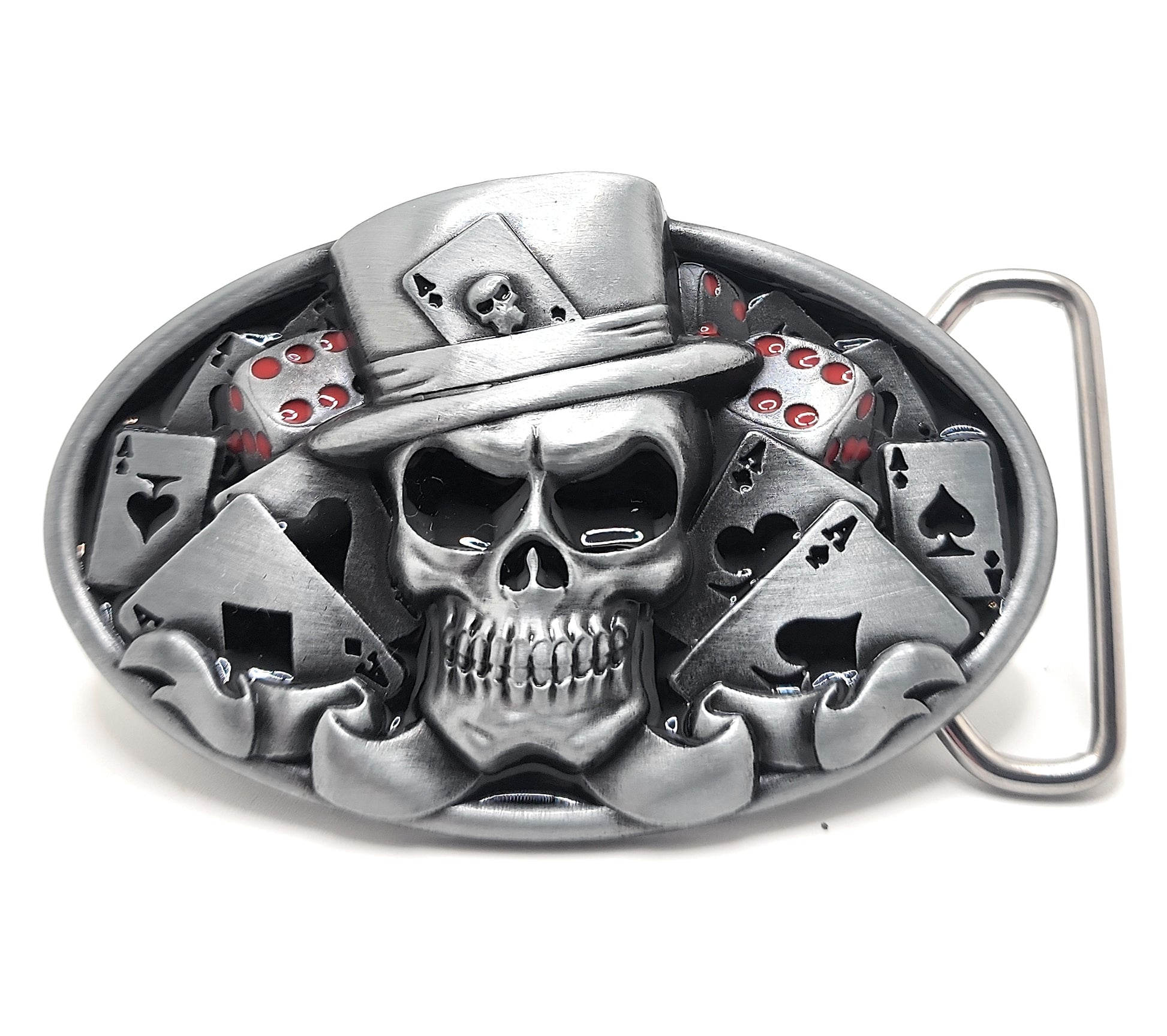 Skull Poker Belt Buckle – Grinning Top Hat Skull with Cards and Dice Gothic Casino Gambler Statement Buckle