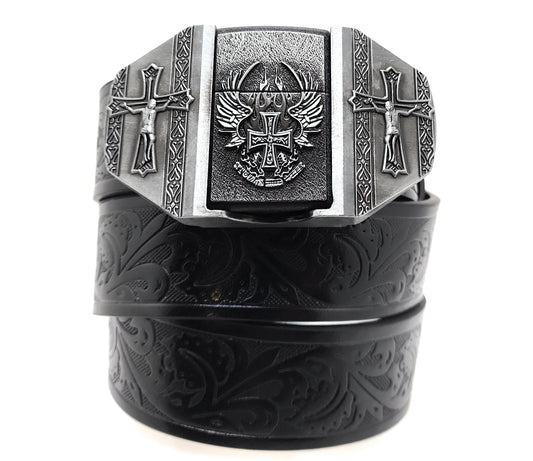 Winged Cross Crucifix Lighter Belt Buckle and Black Embossed Belt — Integrated Refillable Lighter