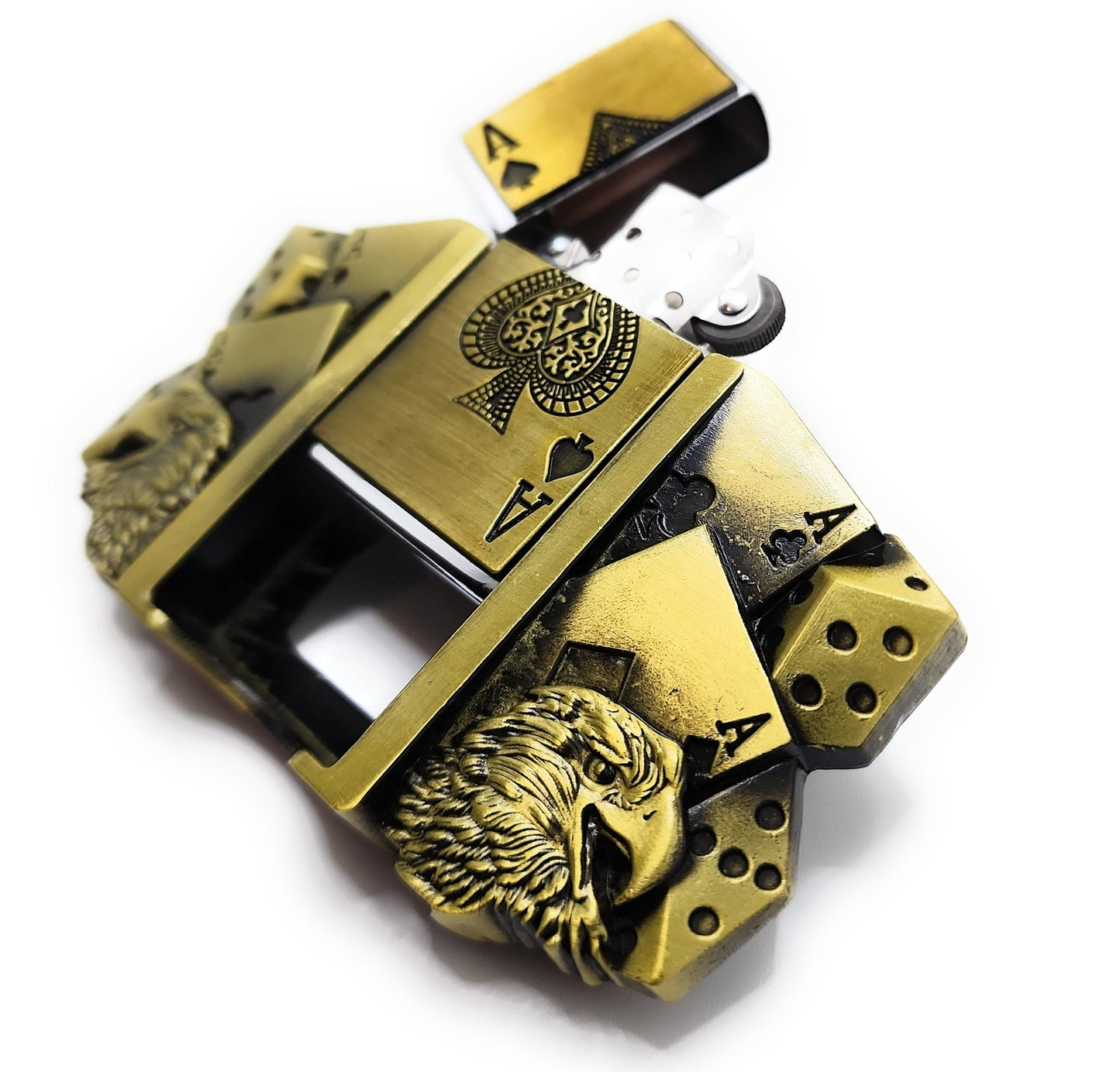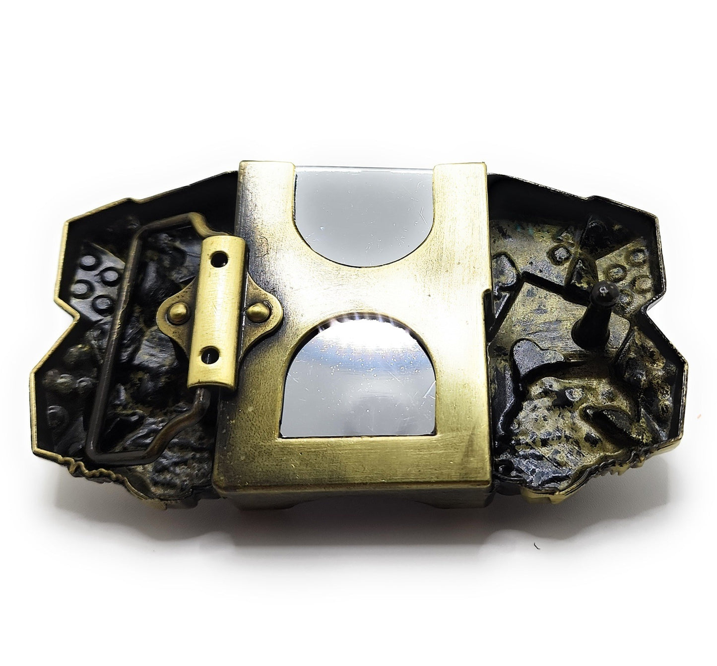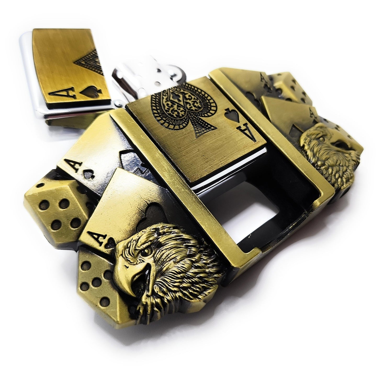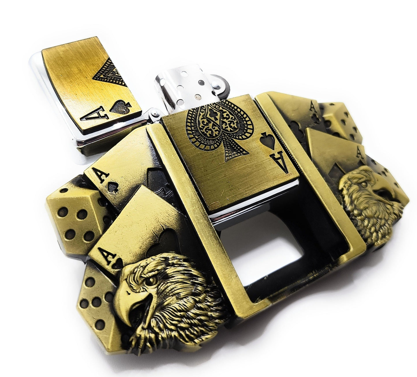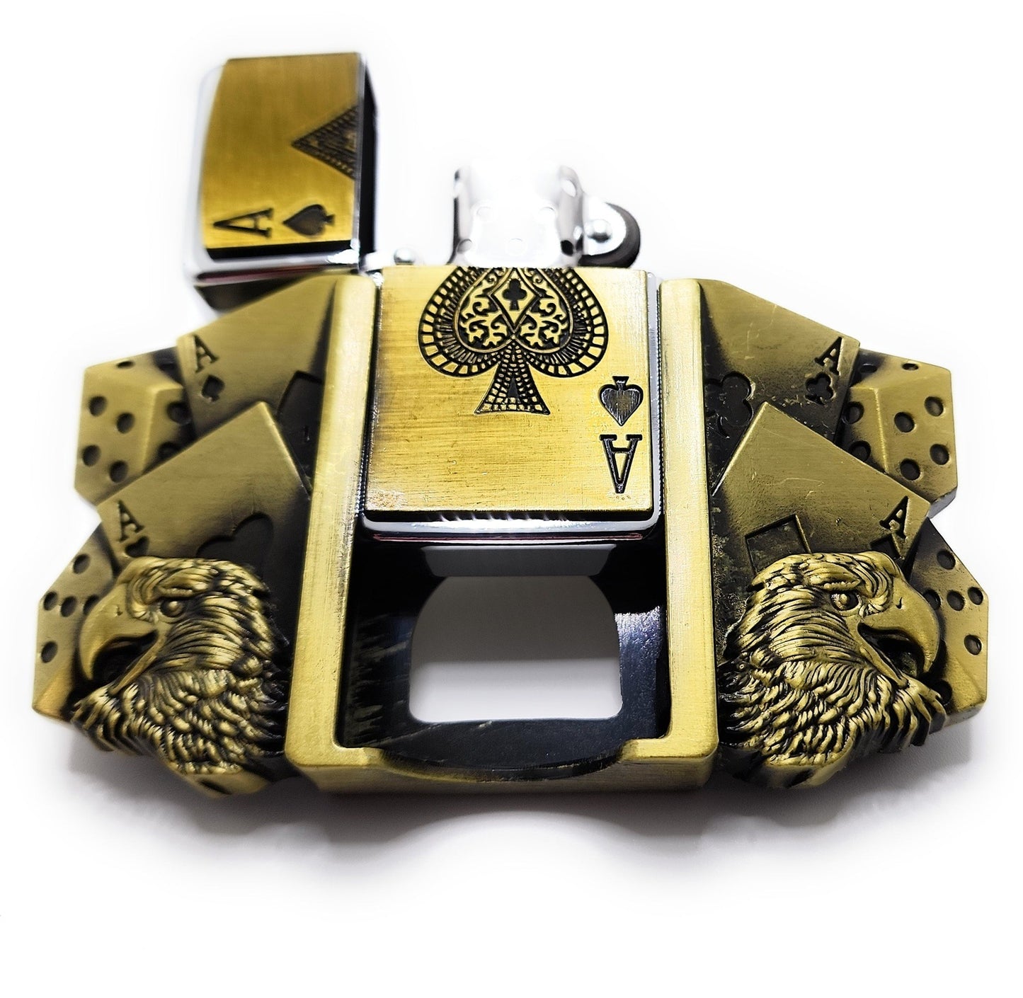 Echa un vistazo a este encendedor con hebilla de cinturón de escalera real de póquer de primera calidad con su propio encendedor as de picas estilo flip. Una forma elegante de sujetar los pantalones y, al mismo tiempo, esconder su encendedor estilo flip favorito en la parte delantera de la hebilla.