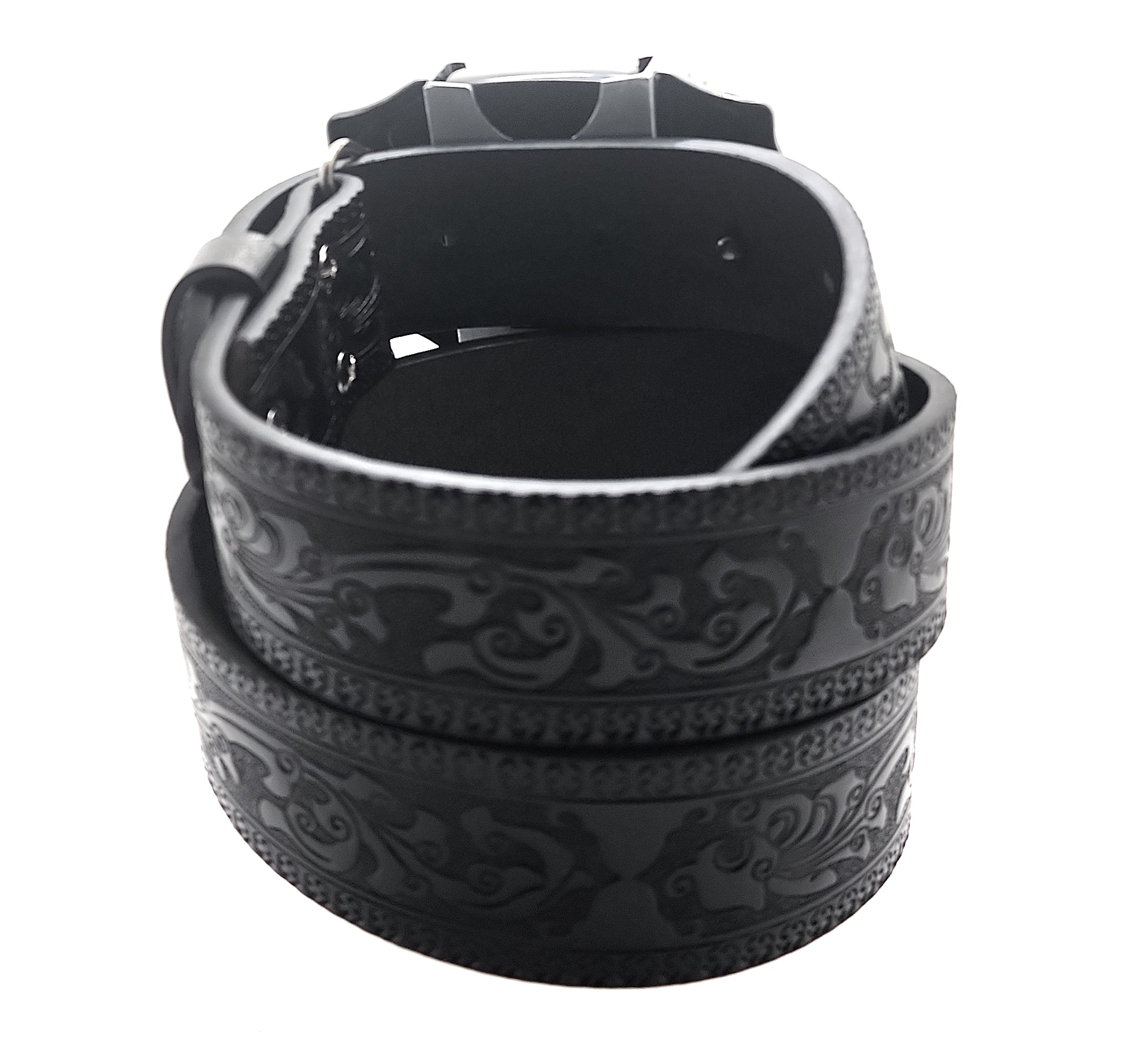 - ✒️ Black wood-scroll embossed strap—bold Western pattern with smooth interior