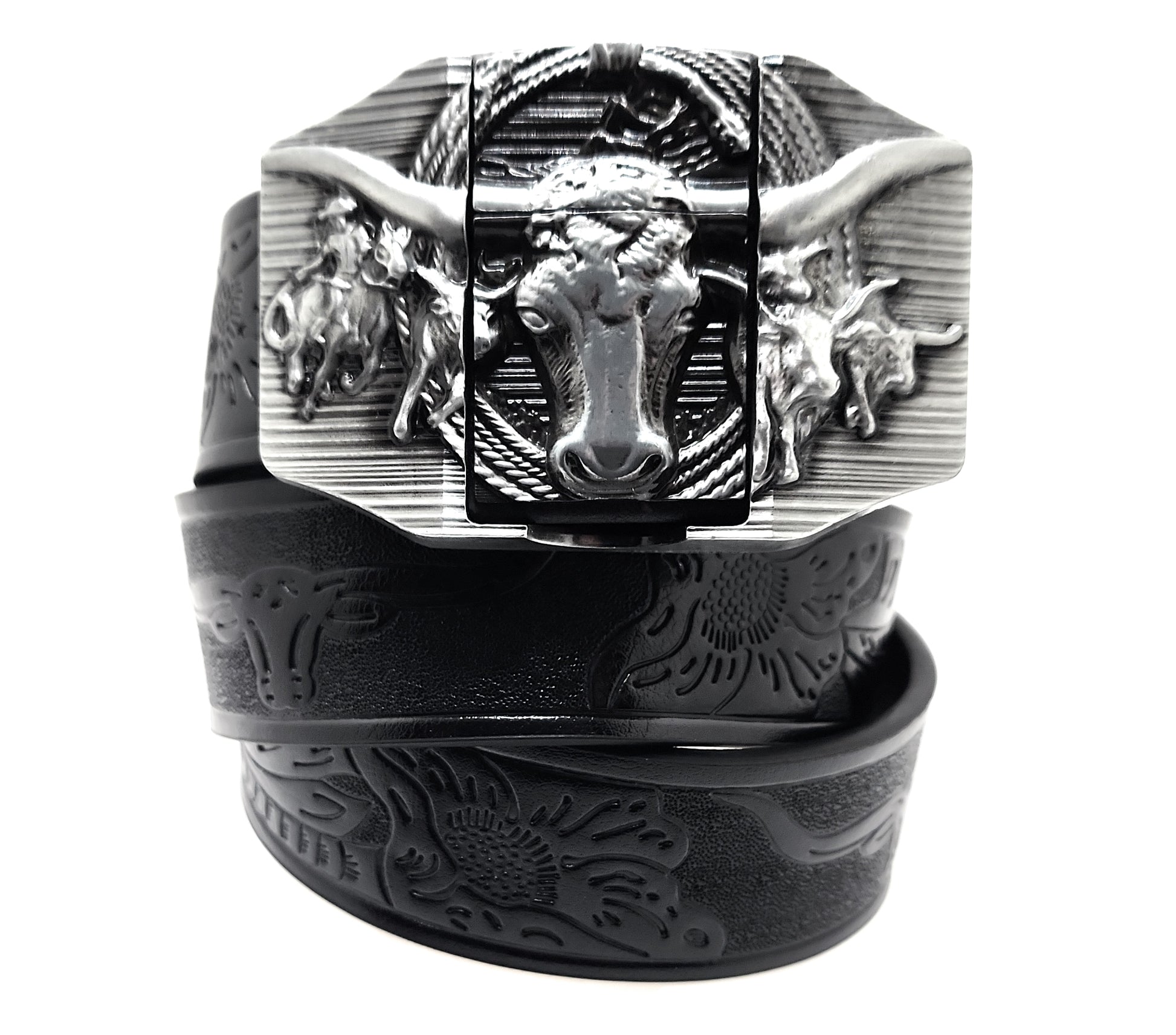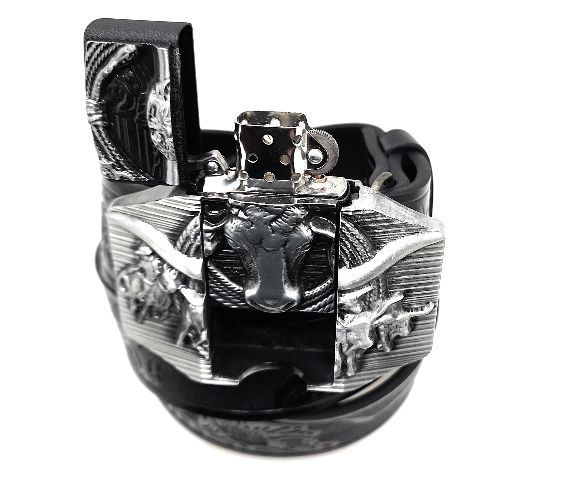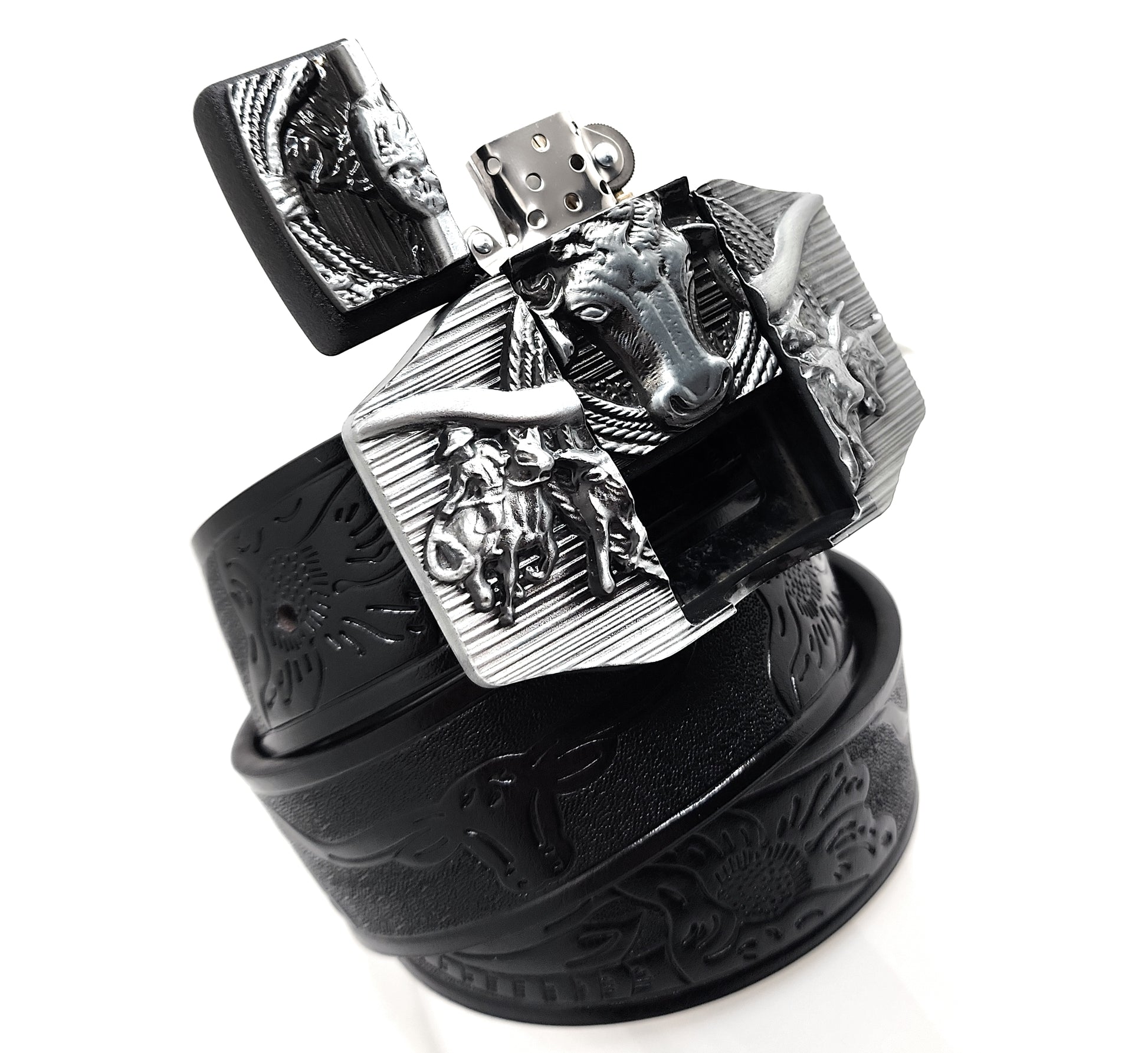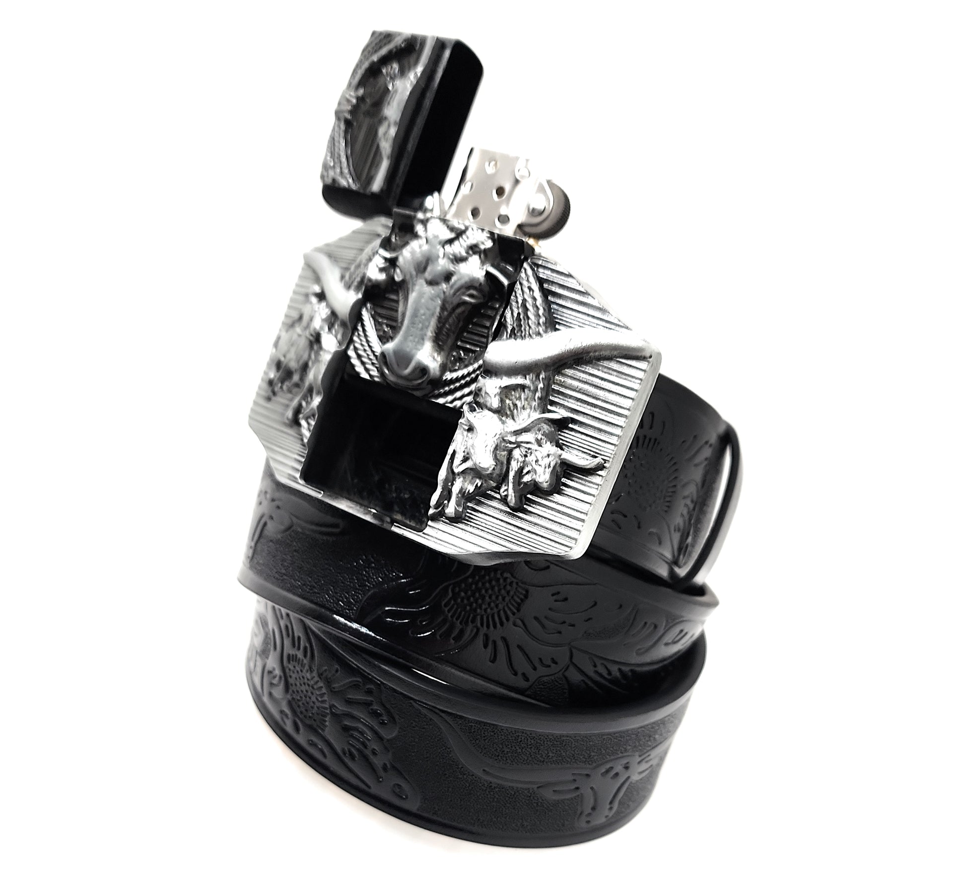 Silver Longhorn Lighter Belt Buckle and Black Belt (Embossed with Longhorns and Floral Pattern)