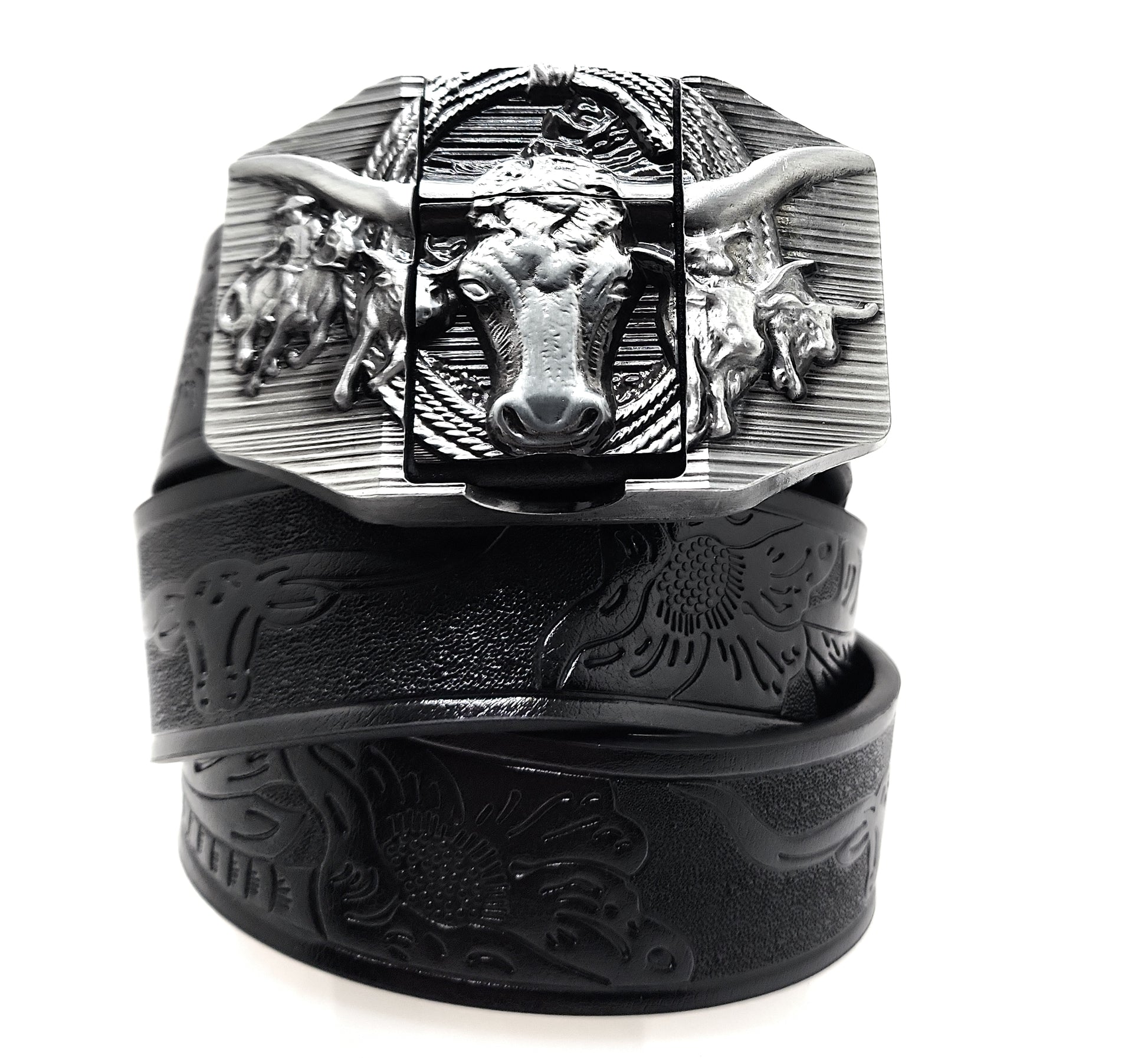 - 🐂 Silver 3D Longhorn buckle with herd & rope detail