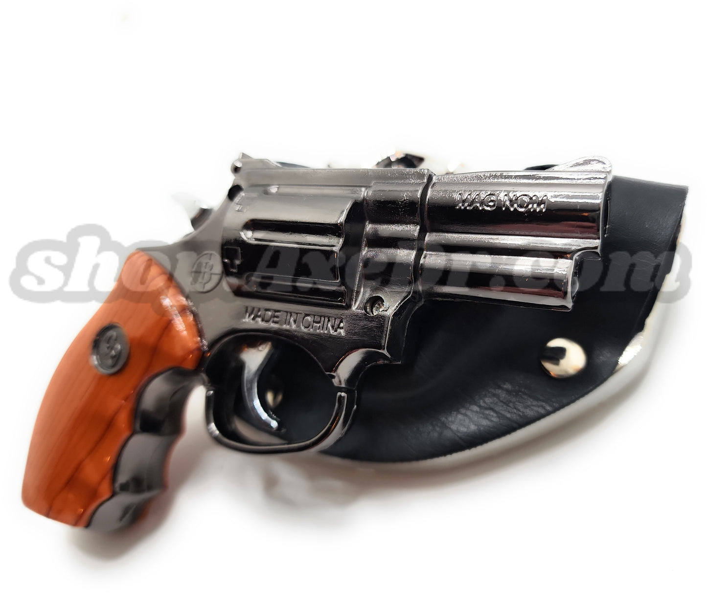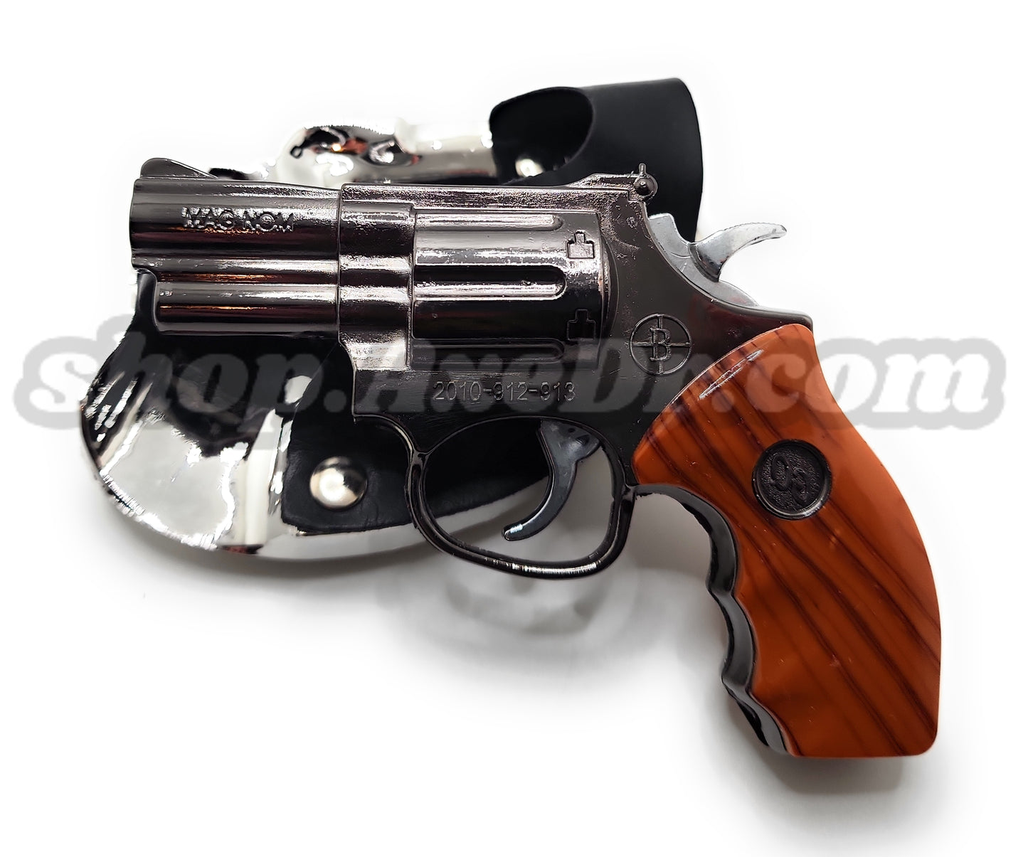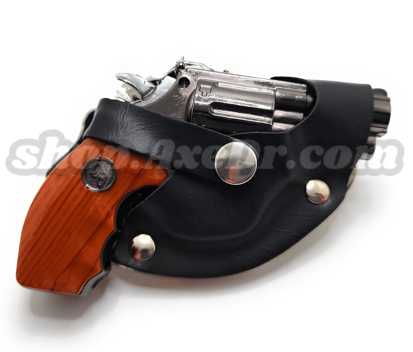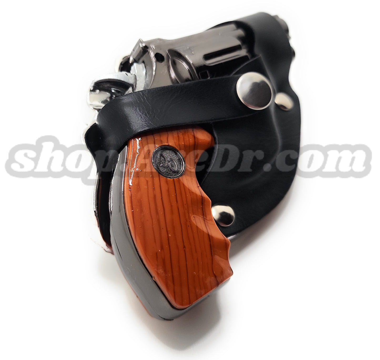 Check out this sick Snub Nose Revolver Pistol Jet Lighter and Flashlight Belt Buckle. Pistol is held securely in buckle by it's holster. The Hammer controls the Butane-Powered Jet Flame, and the Trigger controls a bright white LED Flashlight. Super cool belt buckle.